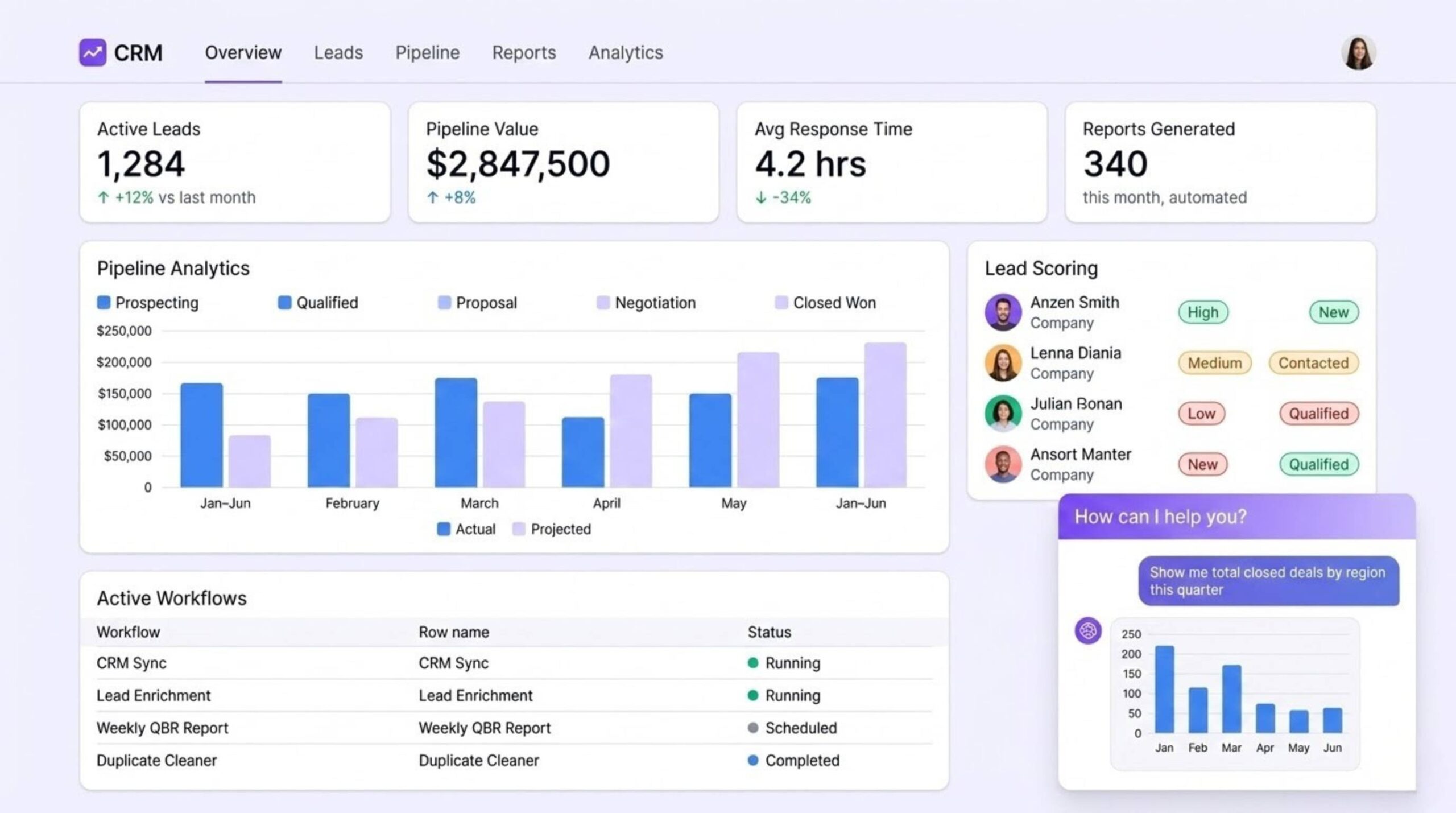 CRM systems hold valuable signals — deal velocity, lead quality, churn risk — but getting to those signals means someone spends hours every week pulling exports, cleaning duplicates, reconciling spreadsheets, and rebuilding the same report they built last month.