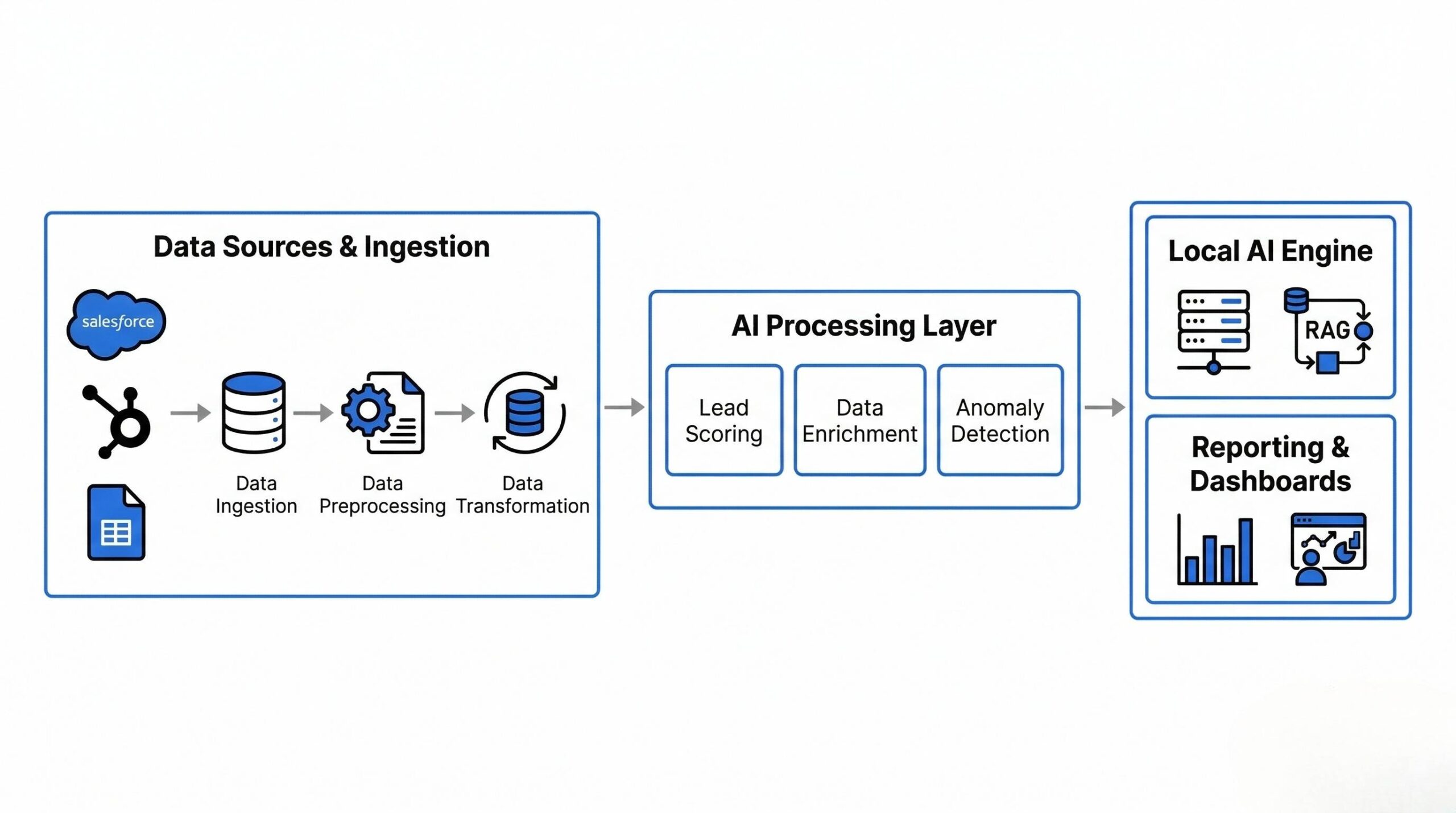 A multi-source data pipeline that connects CRM platforms and spreadsheets into a single automated intelligence layer. Data flows in from Salesforce, HubSpot, and Google Sheets, gets cleaned and enriched, passes through a local AI engine, and comes out as reports, scored leads, and queryable insights — on a schedule or in real time.